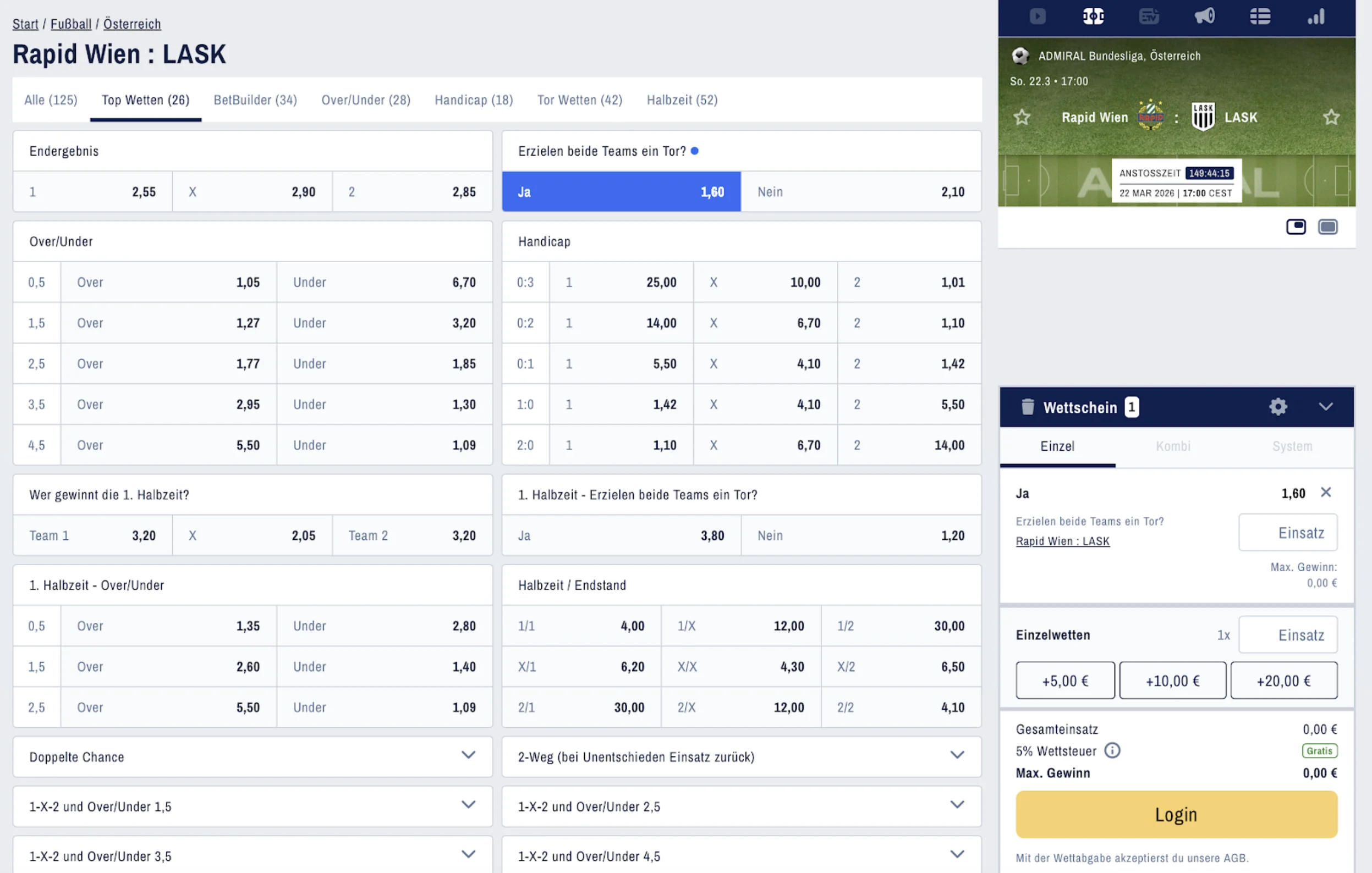 Bleiben wir beim obigen Beispiel: Wenn entweder Rapid oder Sturm Graz kein Tor erzielt, verlierst du deine BTTS „Ja“-Wette und der Buchmacher behält deinen Einsatz. Wenn du ein enges Spiel erwartest, kannst du auf BTTS „Nein“ setzen. Hier brauchst du, dass mindestens eines der Teams nicht trifft, um einen Gewinn zu erzielen. Treffen beide, geht dein Geld an den Buchmacher.