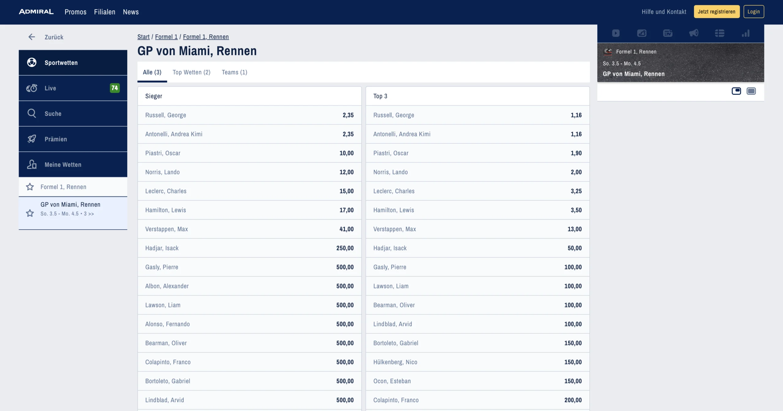 Wenn du einem Fahrer ein starkes Rennen zutraust, aber nicht sicher bist, ob er gewinnt, kannst du auf eine Podiumsplatzierung setzen. Dabei tippst du darauf, dass ein Fahrer unter die ersten Drei kommt – also einen Platz auf dem Podium erreicht. Die genaue Platzierung spielt keine Rolle, und du gewinnst nicht mehr, wenn er Erster statt Dritter wird. Diese Wette deckt alle drei Podiumsplätze ab.