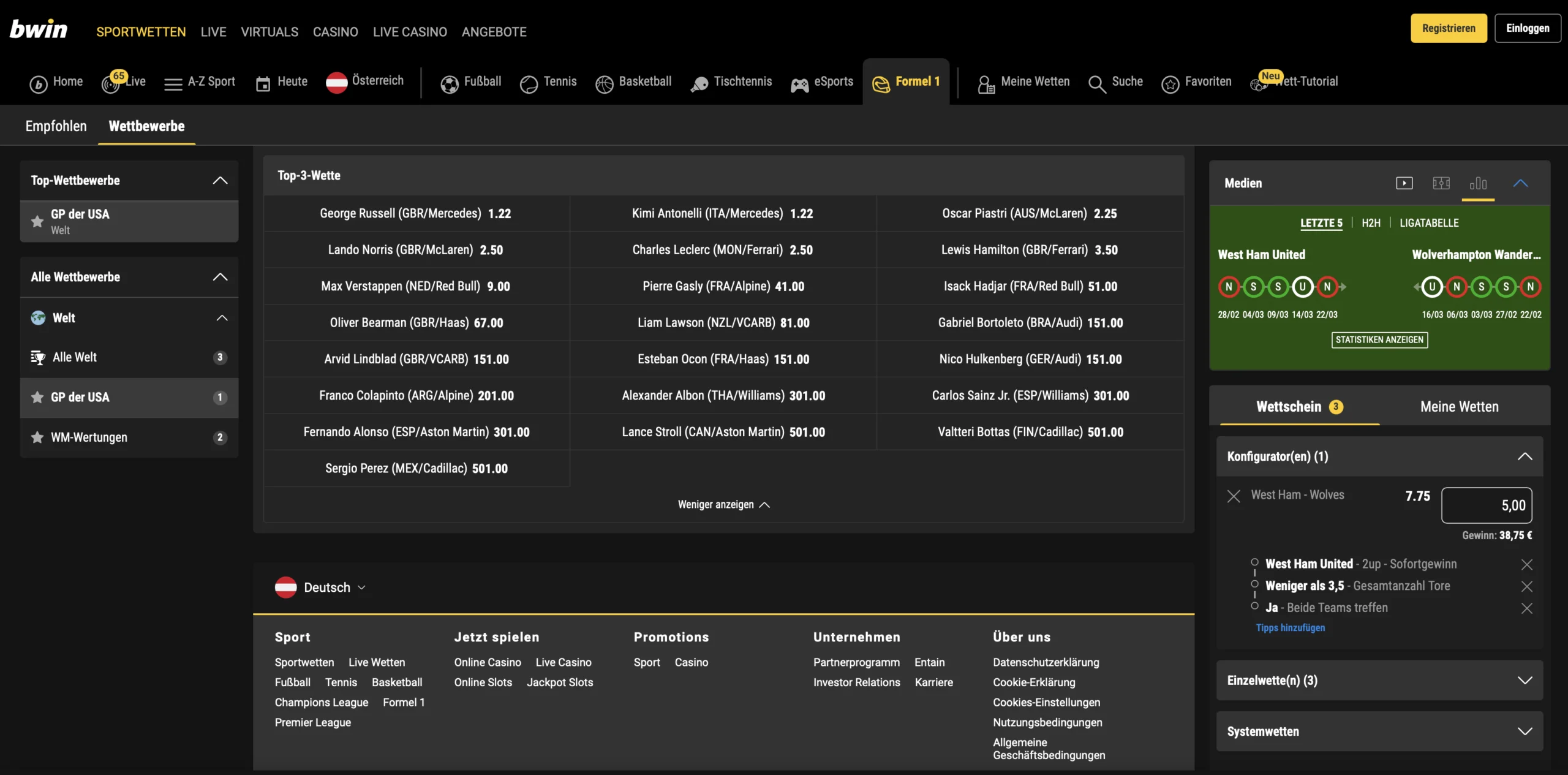 - 1.Die besten Buchmacher für Formel 1 Wetten