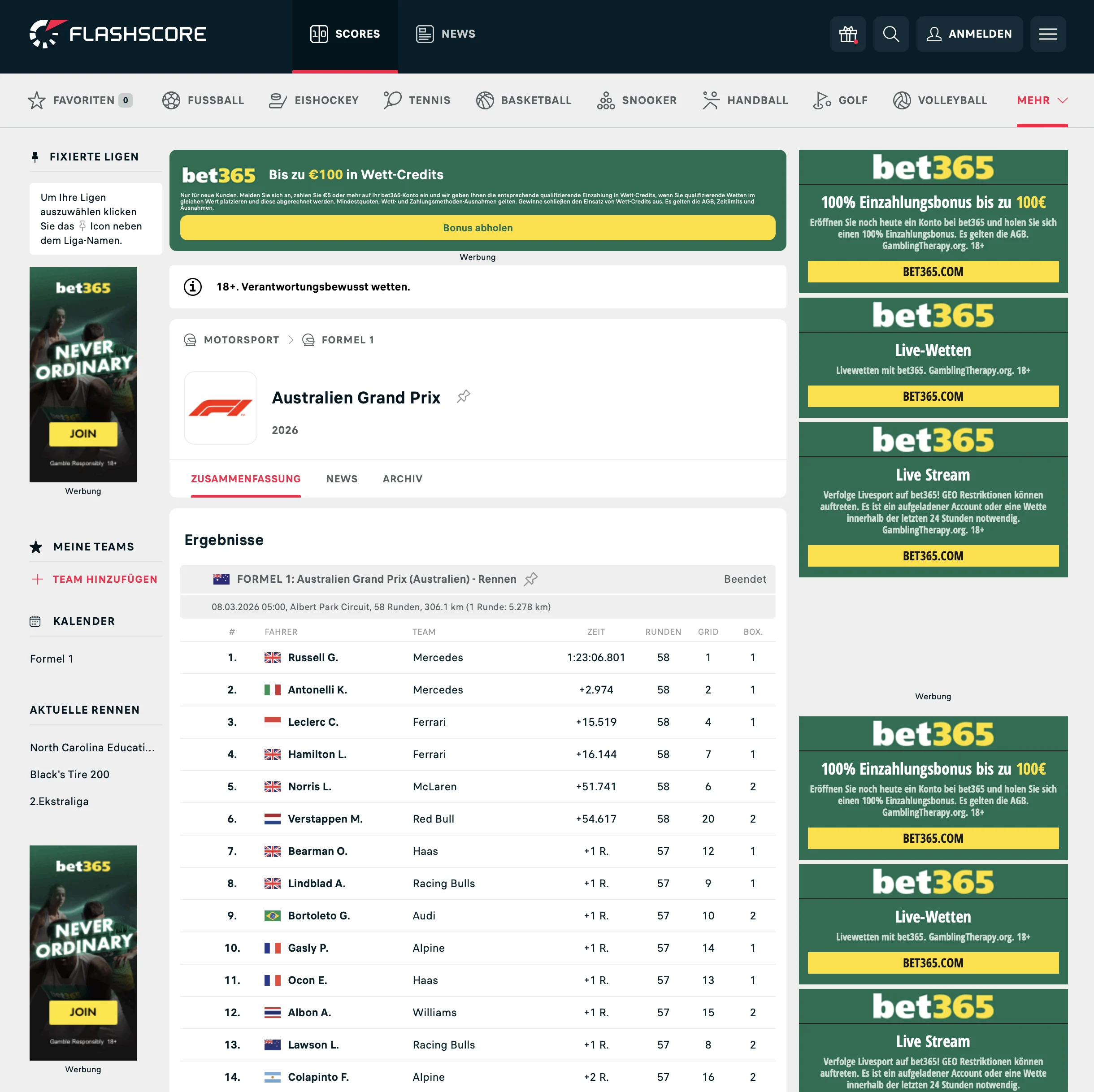 Leistung zu verfolgen ist entscheidend – und Flashscore-Nutzer profitieren von Live-Updates und Leaderboards zu allen Sessions, inklusive Training, Qualifying und dem Grand Prix. Echtzeit-Infos sind ideal für F1 Live Wetten oder um das Feld einzugrenzen.