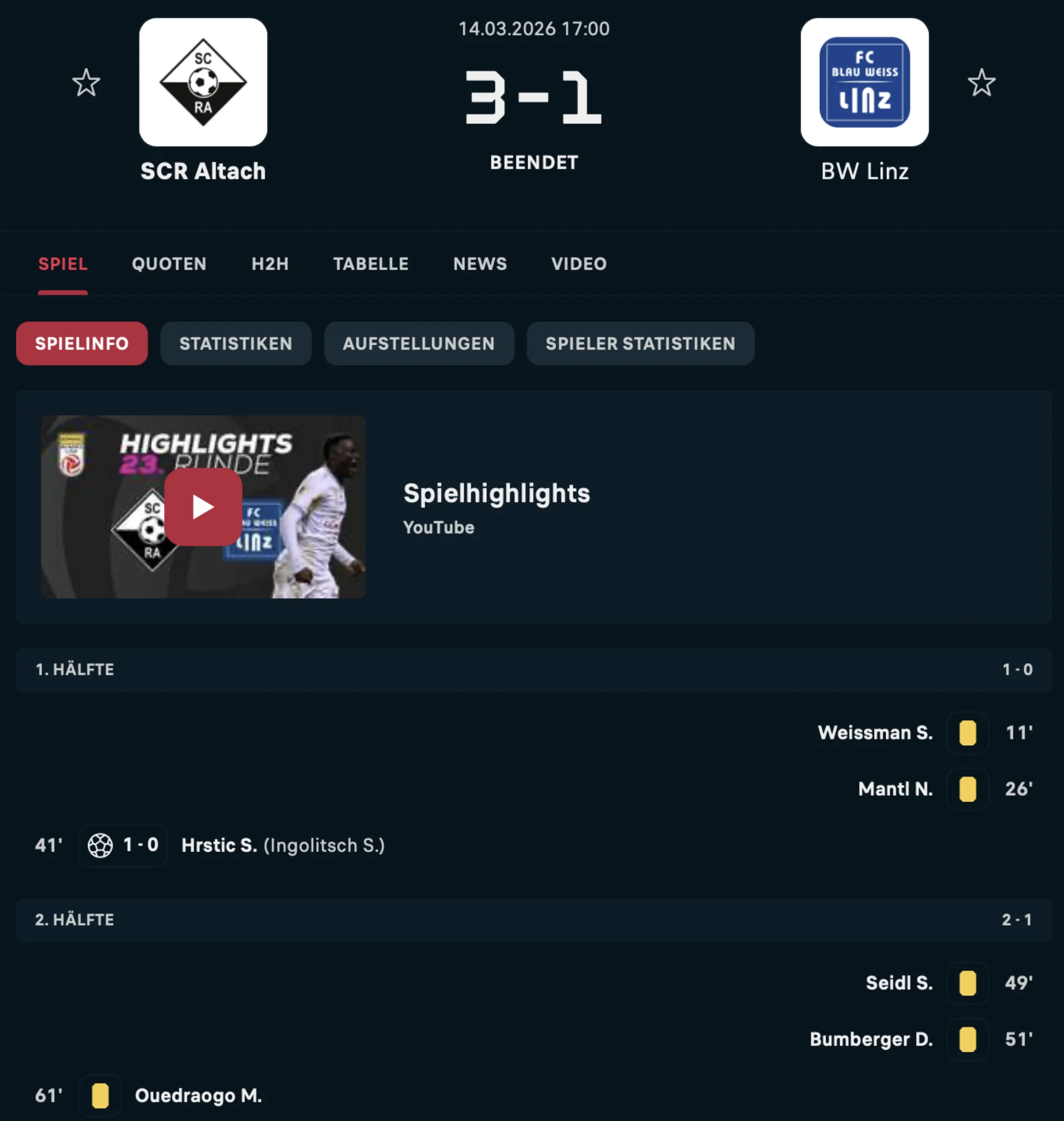 Flashscore hat für jeden Spieler der großen Teams ein Profil. Dort findest du die Disziplinarstatistik – ideal, um deine Kartenwetten zu überprüfen, etwa ob ein Spieler gebucht oder vom Platz gestellt wird.