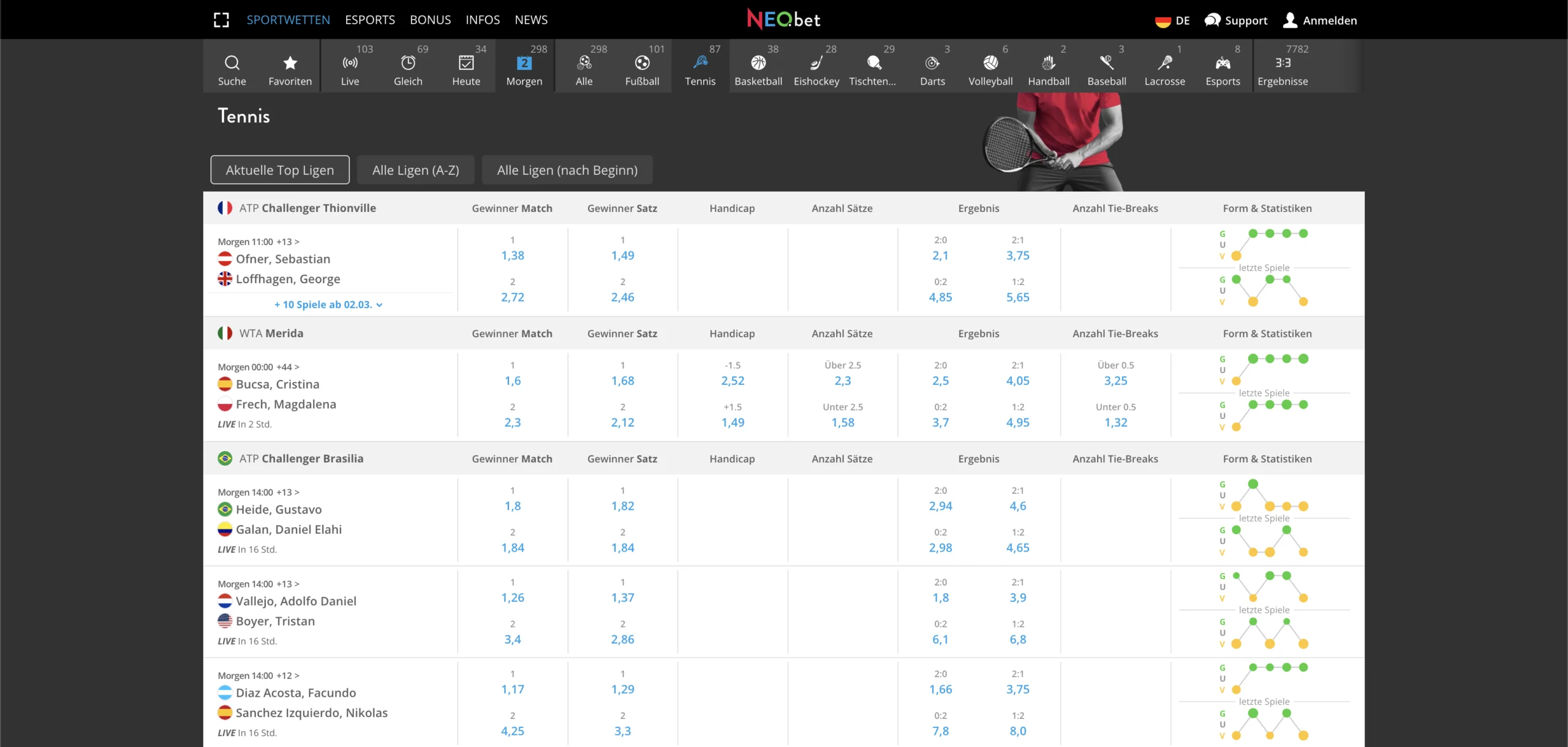 Da es im Profitennis kein Unentschieden gibt, hast du eine 50:50-Chance, den Sieger richtig zu tippen. Wähle deinen Favoriten und setze auf ihn als Sieger. Gewinnt dieser das Match wie erwartet, landet dein Gewinn auf deinem Konto.